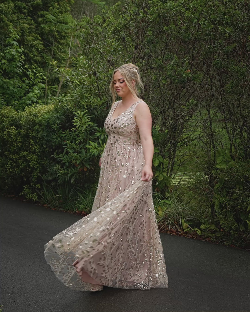 A playful showstopping dress for the cheeky elegant bride, our Kokomo gown is embellished with intricately hand-placed gold sequin leaf details. With a matching V neckline and backline, this whimsical ensemble comes with a full circle skirt and a lustrous mocha underlay that is a gorgeous piece for walking down the aisle or dancing the night away. Dry clean only.