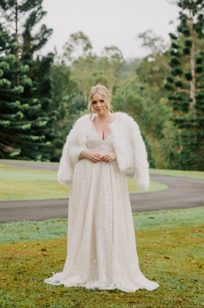A fun addition to any bride's outfit, this bolero is feminine and pairs well with a vintage theme. This bolero has slightly more coverage than our Ostrich Shrug. Available in multiple colours.
